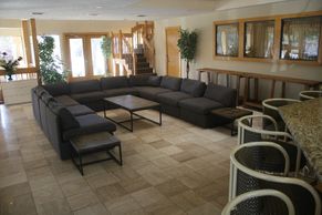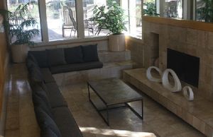 The "Well", a meeting and seating area with a fireplace - open to and adjoining the main area but down a few steps.